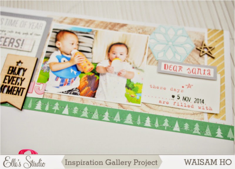 And here's the first layout I made using Elle's Studio Good Cheer collection, coordinate with November kit, I like how the yummy food tags go so well with the photos of two babies drinking milk. These two babies are the best thing ever happened to our family, and of course I couldn't miss the chance of scrapbooking the photo of them being together.